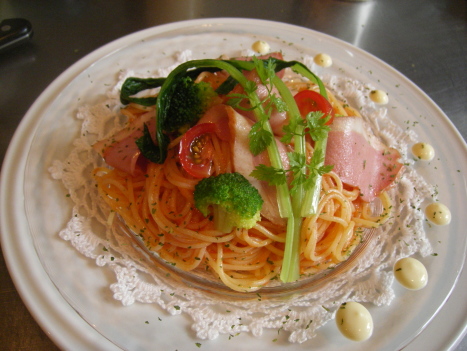 完熟トマトの冷たいパスタ、カモの燻製と季節の野菜添え。